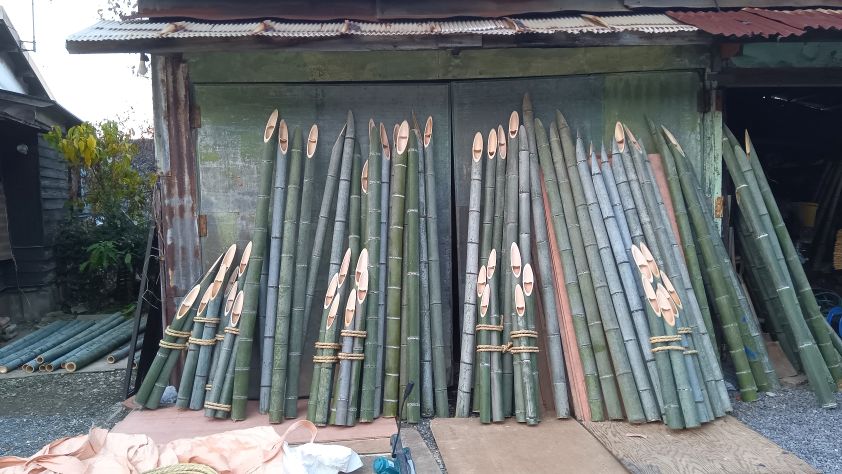 福岡県は北九州市内にて門松制作中の一コマです。竹の子で有名な合馬の竹を地主さんから直接持ってきていただいています。急な山の斜面から積んで持ってきてもらうので大変な作業です。それを斜めに機械でカットしていきます。